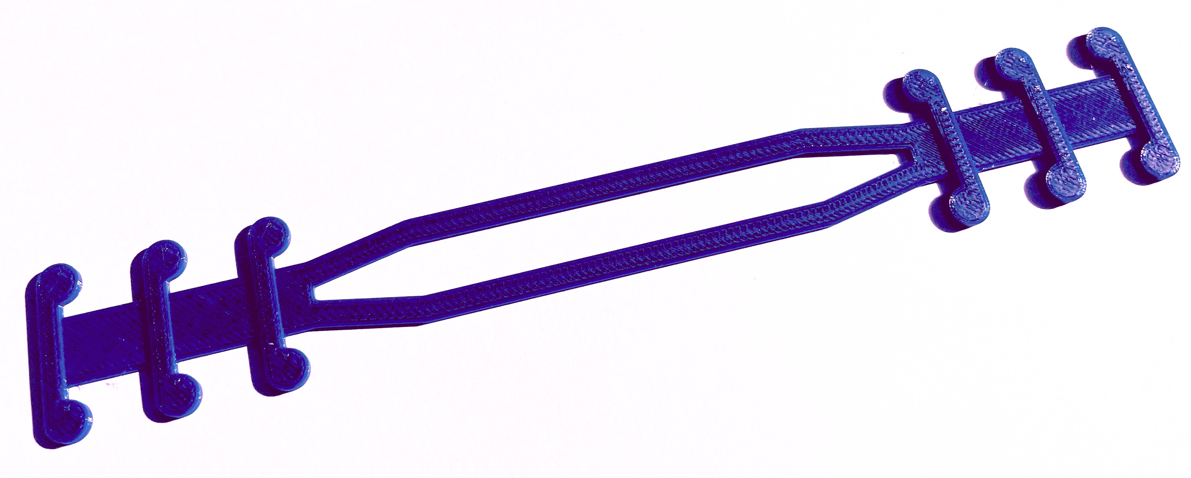 Damit der Maskenhalter sich gut an den Kopf anschmiegt muss er beigsam sein. Der erste Weg zur Biegsamkeit ist die richtige Filamentwahl. Der zweite Weg ist, den Maskenhalter vor allem in dem (mittleren) Bereich, in dem er gebogen wird, flach zu halten (1mm) und die Materialmenge zu reduzieren. So ist das obige Modell entstanden. Mehrere Haken an beiden Enden ermöglichen individuelle Einstellungen.