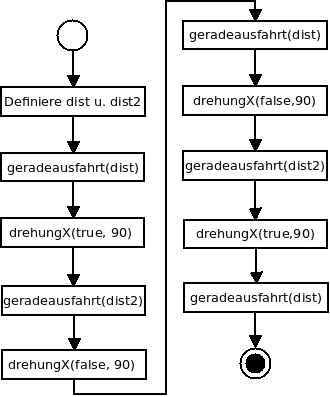 Augenscheinlich fehlt noch ein Baustein, die geradeausfahrt(dist) muss noch ergänzt werden. Aus dem Flussdiagramm kann man die Reihenfolge der Aufrufe der vorhandenen Methoden in ein Programm übertragen.