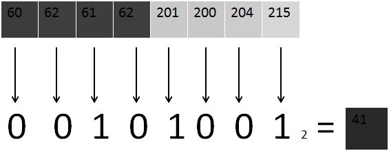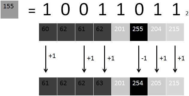 Zum Herauslesen eines Pixels des geheimen Bildes werden die dazugehörigen acht Pixel im öffentlichen Bild betrachtet. Ein gerader Wert steht für eine 0, ein ungerader Wert für eine 1. Diese acht Werte bilden die Binärzahl des Graustufenwertes des geheimen Bildes.