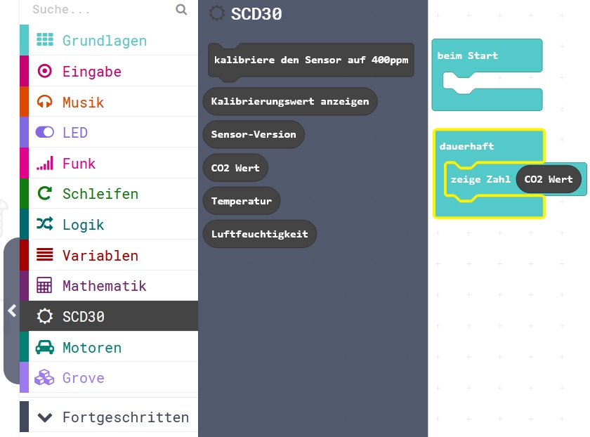 Mit der Erweiterung SCD30 geht das in Makecode so: