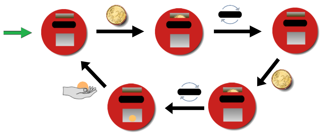 Das Übergangsdiagramm auf der vorhergehenden Seite soll die Funktionsweise des Kaugummiautomaten genau beschreiben. Ob er wirklich so funktioniert, kannst du hier überprüfen. In der folgenden Aufgabe siehst du den Automaten und das Diagramm gleichzeitig. Im Diagramm ist der aktuelle Zustand des Bubble-o-mat grün umrandet. Zu Beginn befindet er sich also im Zustand oben links ("Warten auf Geld").Aufgabe 1