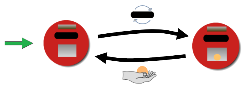 Klicke auf die grüne Fahne und hole dir einen neuen Kaugummi. Beobachte dabei die Zusammenhänge zwischen der Bedienung des Automaten und der Darstellung im Übergangsdiagramm.