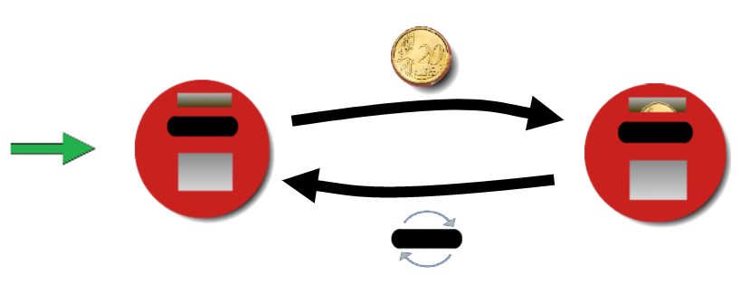 Denke dir eine weitere Funktionsweise des Kaugummiautomaten aus und beschreibe sie mit Worten und mit einem Übergangsdiagramm!