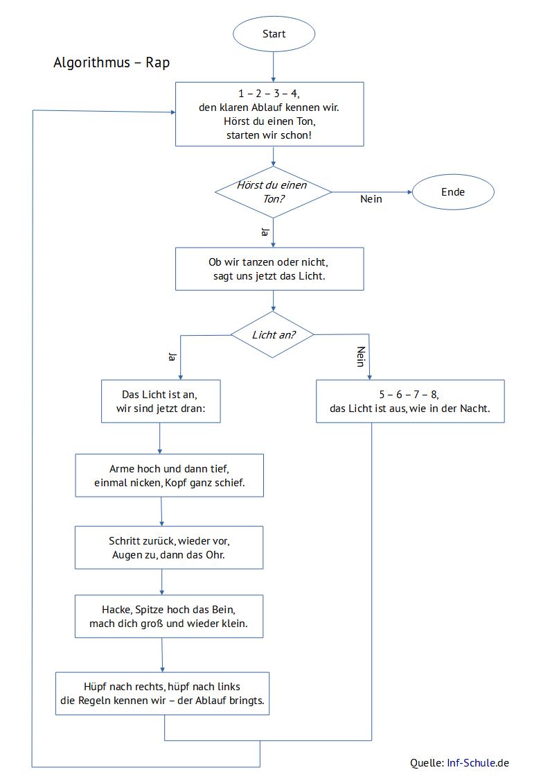 Bevor ihr diesen Algorithmus-Rap singt und tanzt, müsst ihr einen Spielleiter oder eine Spielleiterin festlegen, um einen Ton (wie z.B. Pfeifen, Klangschale, ...) zu machen und das Licht an- oder auszuschalten.