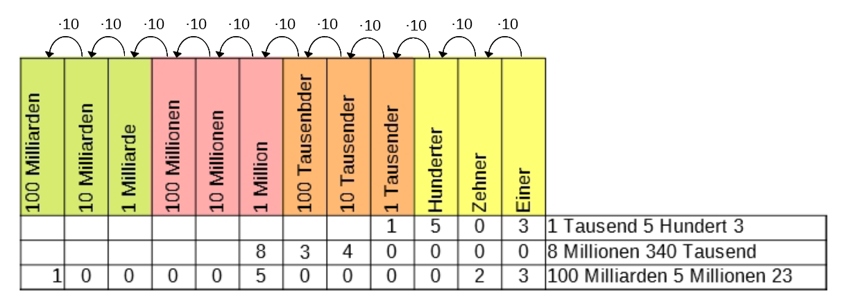 Unser Zahlensystem, das wir im Alltag und in der Schule verwenden, nennt man Zehnersystem. Diesen Namen kannst du dir mit einer Stellenwerttafel sehr schön veranschaulichen: Um zur nächsten Stelle zu kommen, multipliziert man mit 10.