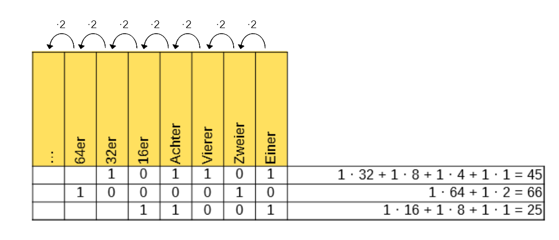 Binärzahlen werden nur mit 0 und 1 dargestellt. Die Stellen erhält man, indem man die vorherige Stelle jeweils verdoppelt (Einer, Zweier, Vierer, ...). Die Binärzahl selbst erhält man, indem man die Stellen, denen eine 1 zugewiesen wurde, addiert: Zum Beispiel 101 = 1 · 4 + 1 · 1 = 5.