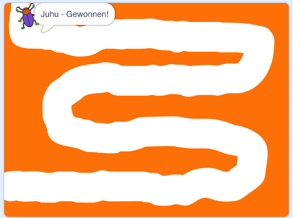 Wenn du den Käfer fehlerfrei bis zum oberen Ende des Labyrinths gelenkt hast und er den Rand berührt, soll er für 2 Sekunden "Juhu - Gewonnen!" sagen. Anschließend soll das Skript gestoppt werden.