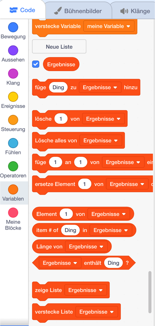 Nach dem Erstellen der Liste "Ergebnisse", werden in der Kategorie Variablen neue Befehlsblöcke angezeigt.