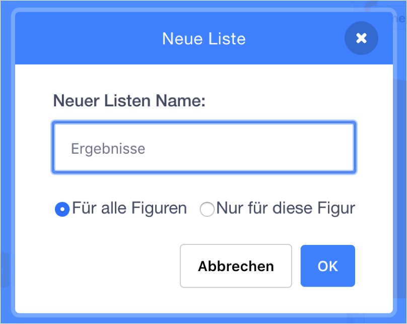 Eine Liste erstellst du in der Kategorie Variablen (orangerot). Dort klickst du auf die Schaltfläche "Neue Liste", gibst einen Namen für die neue Liste ein (Ergebnisse) und bestätigst mit "OK" die Auswahl "für alle Figuren".