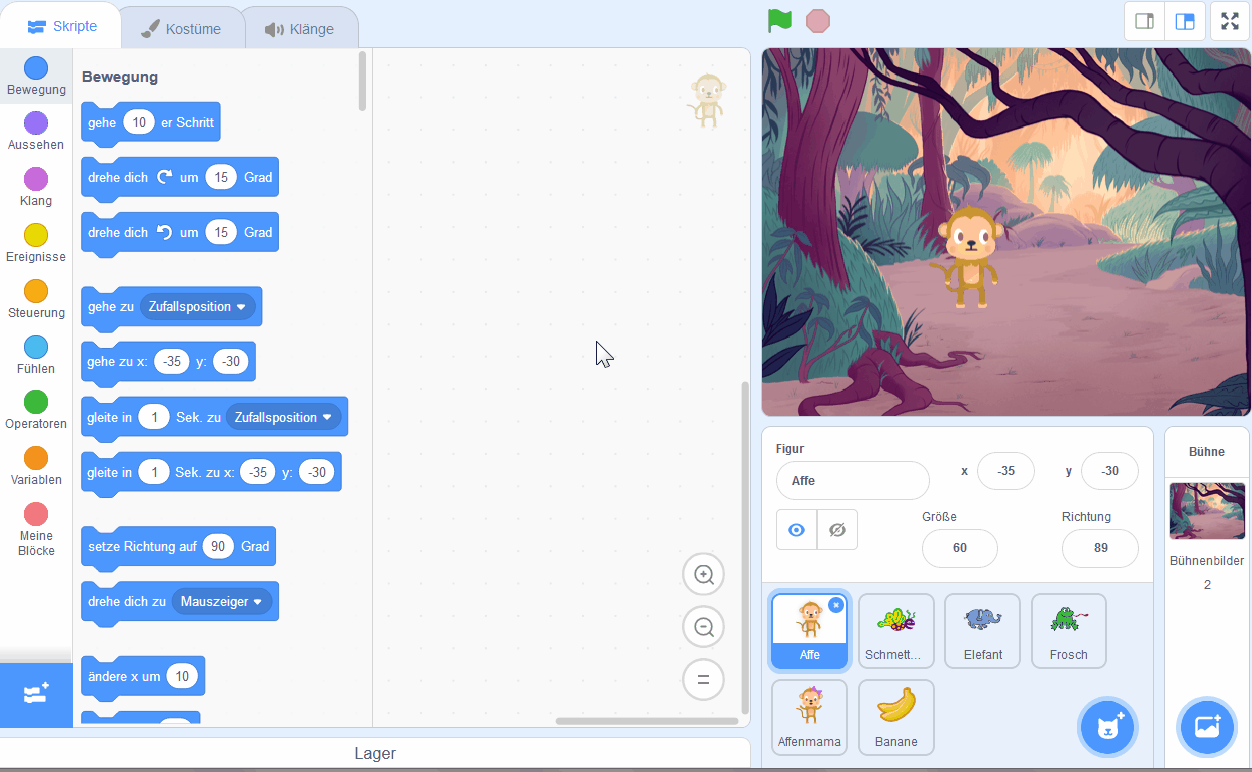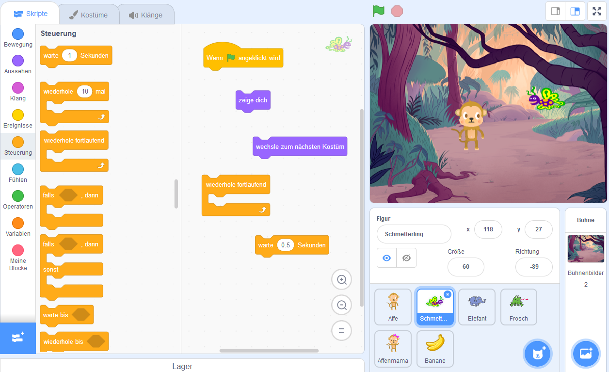 - den Schmetterling mithilfe der Steuerung Wiederhole fortlaufend, einem Kostümwechsel und dem Warte-Befehl auf der Stelle fliegen lässt.