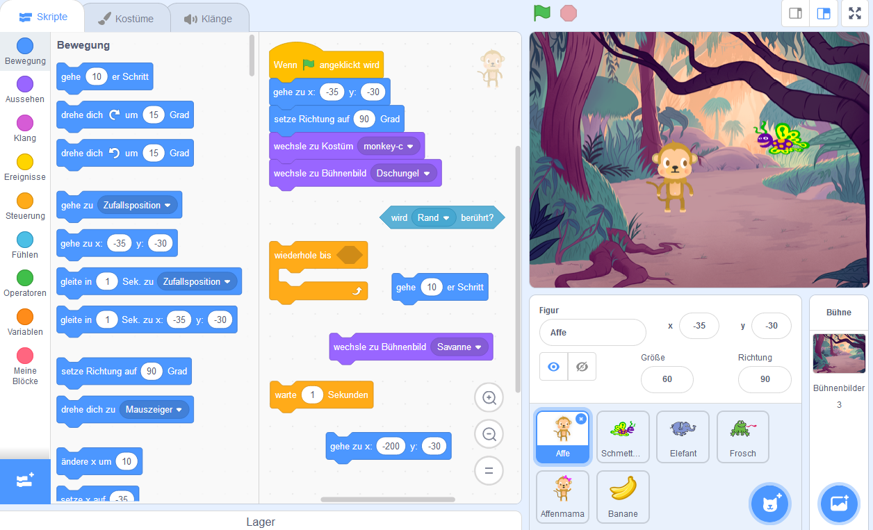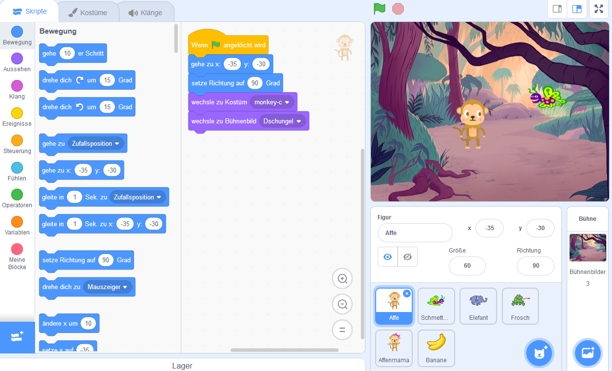 Damit unsere Geschichte immer wieder von vorne startet, wenn die grüne Flagge geklickt wird, legen wir für den Affen sogenannte Ausgangsparameter fest.