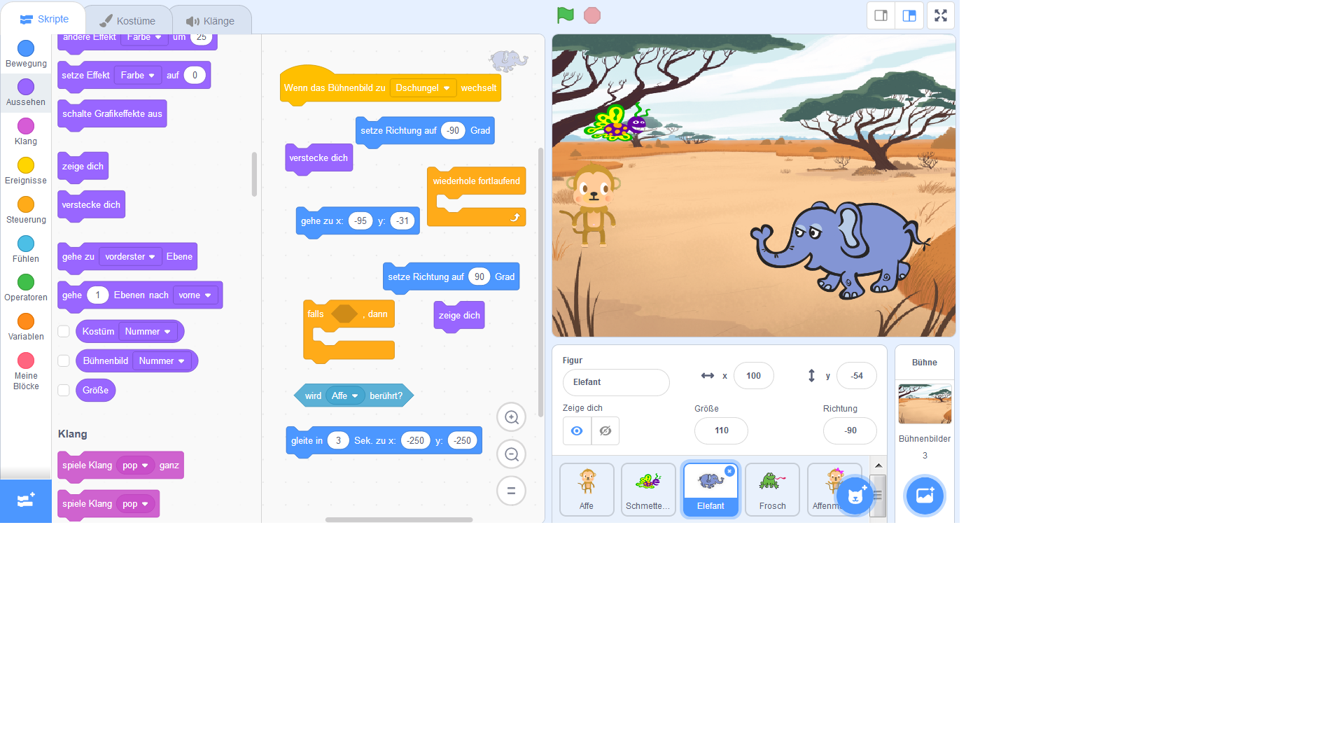 - Schmetterling und Affen an den Waldrand (neues Bühnenbild) fliegen / gehen lässt und dort