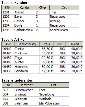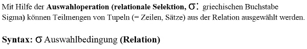 Mit der relationalen Algebra lassen sich Operationen auf Relationen (Tabellen) durchführen. Ein Vorteil dieser Möglichkeit ist, dass dies von Hand gemacht werden kann und kein Computer benötigt wird. Natürlich müssen die Relationen vorliegen (z. B. als Ausdruck auf Papier).