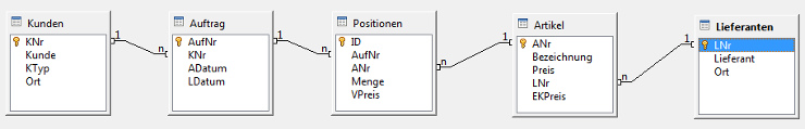 1. Erstelle diese Datenbank und lege die Tabellen an.2. Definiere die Beziehungen zwischen den Tabellen. Die Inhalte der Datenfelder findest du im nächsten Kapitel.