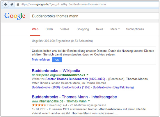 Prüfe bitte auch nach, was der zweite Link der Googlesuche (s. Bild oben: Buddenbrooks - Thomas Mann - Inhaltsangabe zu bieten hat. Welche Kriterien dieser Webseite sprechen dafür, dass hier seriöse Informationen angeboten werden? Was findest du über die Autoren heraus? (Achtung: Möglicherweise steht dieser Link bei einer erneuten Abfrage nicht unbedingt an zweiter Stelle!)