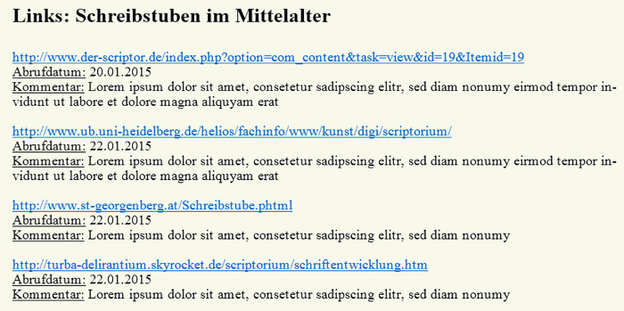 Die gefundenen Links solltest du mit Kommentar nach einem sinnvollen Schema in einer Textdatei abspeichern. Das könnte folgendermaßen aussehen: