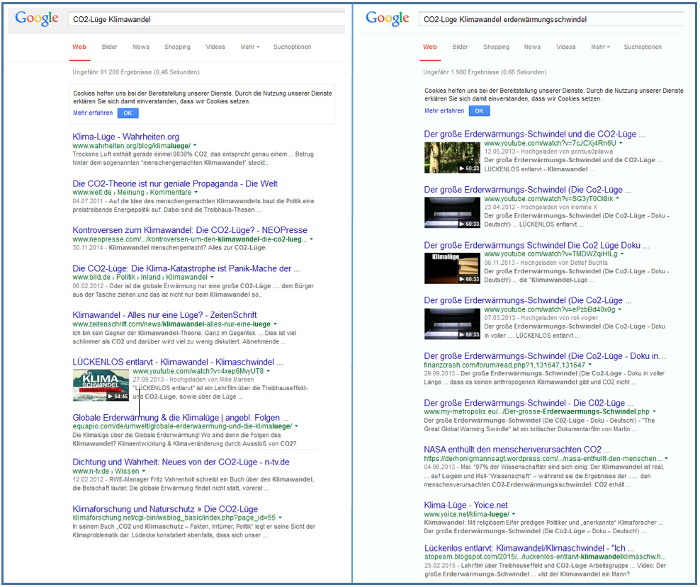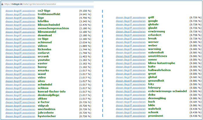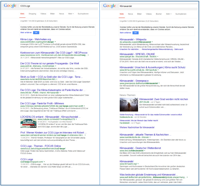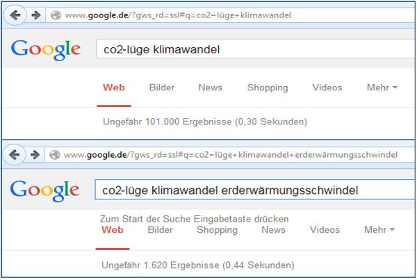 Die im Ranking oben stehenden Ergebnisse zu "CO2-Lüge" und "Klimawandel" scheinen offenbar für unser Thema brauchbar und plausibel zu sein. (Warum?)