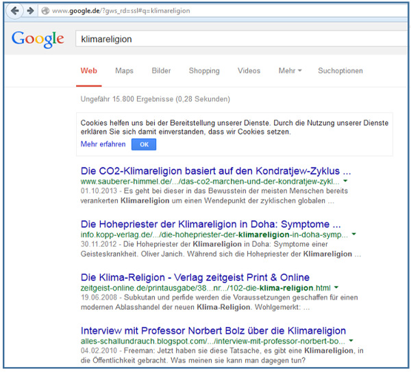 liefert viele Ergebnisse mit dem Titel "Der große Erderwärmungs-Schwindel".