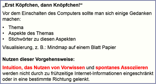 Wir werden diesen Ansatz hier nicht weiterverfolgen, aber eine Auseinandersetzung mit der Aufgabe zum systematischen Recherchieren zu dem oben formulierten Thema müsste diesen Aspekt natürlich auch berücksichtigen.