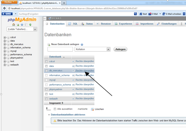Menüpunkt phpMyAdmin angeklickt und in den Bereich Datenbanken gewechselt.