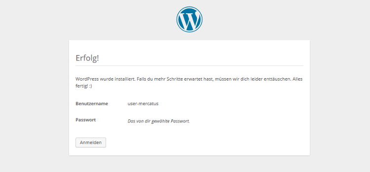 Bild 9: Nachdem auf WordPress installieren geklickt wurde, erscheint (hoffentlich) diese Meldung.