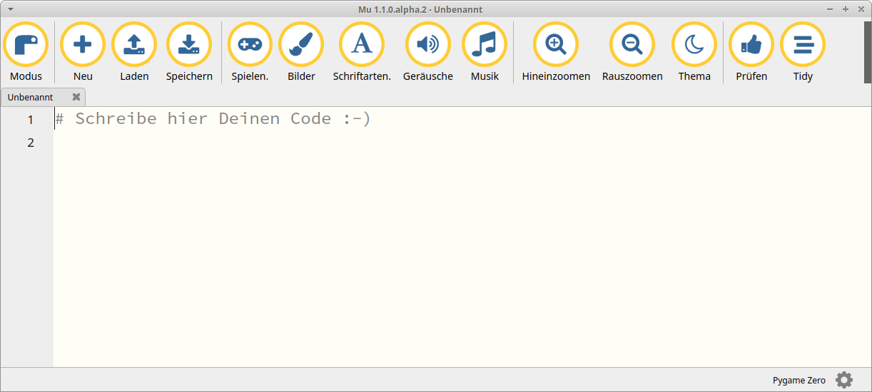 Ganz links oben im Mu-Editor findet sich eine Schalfläche Modus. Beim ersten Mal bei der Benutzung des Editors muss man diese anklicken und dann PyGame Zero auswählen. Danach erscheint im Menü eine Schaltfläche Spielen.