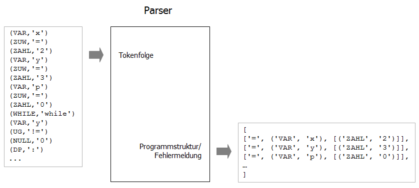 Ein Parser hat nicht nur die Aufgabe, die Syntax zu überprüfen, ein Parser erzeugt zusätzlich auch eine strukturierte Darstellung des vorgegebenen Programms für die weitere Verarbeitung , sofern das Programm syntaktisch korrekt ist.
