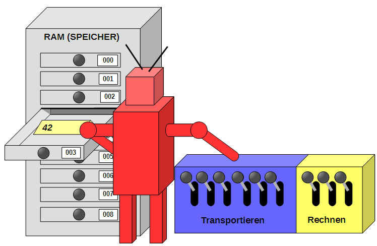 Anschaulich kann man sich den Arbeitsspeicher (RAM) als eine Art Aktenschrank mit Schubladen vorstellen, in denen jeweils eine Zahl liegt. Das Eingeben von Adressen entspricht dem Aufziehen der jeweiligen Schublade. Daneben gibt es eine Reihe von anderen Befehlen, die den Inhalt von Speicherstellen an andere Orte im Rechner transportieren, oder die einfache Rechenoperationen veranlassen. Dies sind die wirklich elementarsten Befehle, die unser Computer versteht. Man nennt diese Befehle deshalb auch Mikrobefehle. Wir werden später sehen, wie das Abarbeiten einer Reihe von Mikrobefehlen durch das Steuerwerk realisiert wird. In den folgenden Graphiken wird das Steuerwerk sinnbildlich durch den roten Roboter dargestellt.Mikrobefehle bei JOHNNY und bei realen Rechnern
