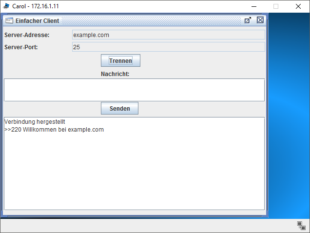 Ist die Verbindung aufgebaut, kannst du im Nachrichtenfeld deine SMTP-Befehle eingeben. Drücke dabei nach jedem Befehl auf „Senden“, um ihn an den Server zu senden und beobachte die Antworten im Ausgabebereich!