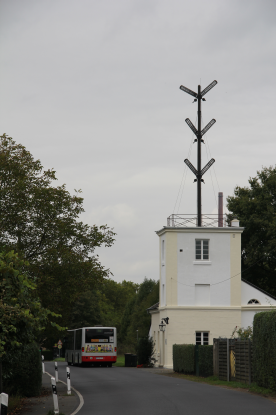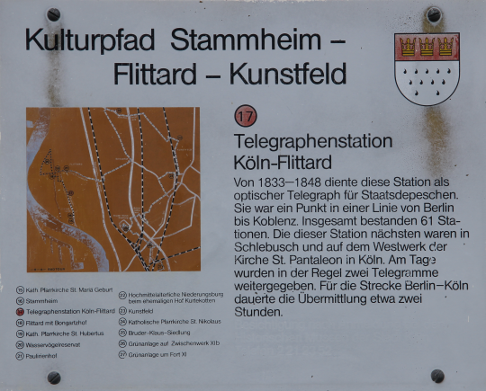 Es handelt sich um die Telegrafenstation Köln-Flittard. Diese Station war Teil der Telegrafenlinie von Berlin nach Koblenz. Viele der Stationen (Wikipedia – Liste der Stationen des preußischen optischen Telegrafen) sind noch erhalten oder wurden wiederhergestellt. Entlang der alten Linie führt heute der Telegrafenradweg