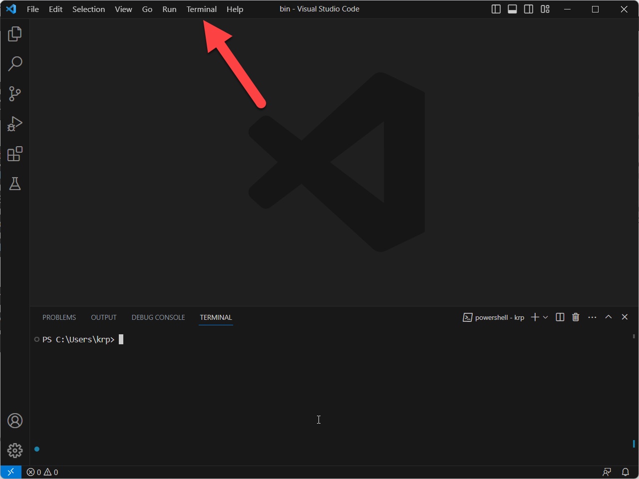 Du kannst jeden beliebigen Texteditor nutzen; für manche Beispiele und Screenshots wird aber von Visual Studio Code ausgegangen. Dieser bietet dir u.a. den Vorteil, dass du sowohl Elm-Editor als auch Terminal in der gleichen Anwendung hast. Wenn du ihn nutzen möchtest, kannst du ihn unter code.visualstudio.com herunterladen. Nach dem Start kannst du in VS Code ein Terminal öffnen: