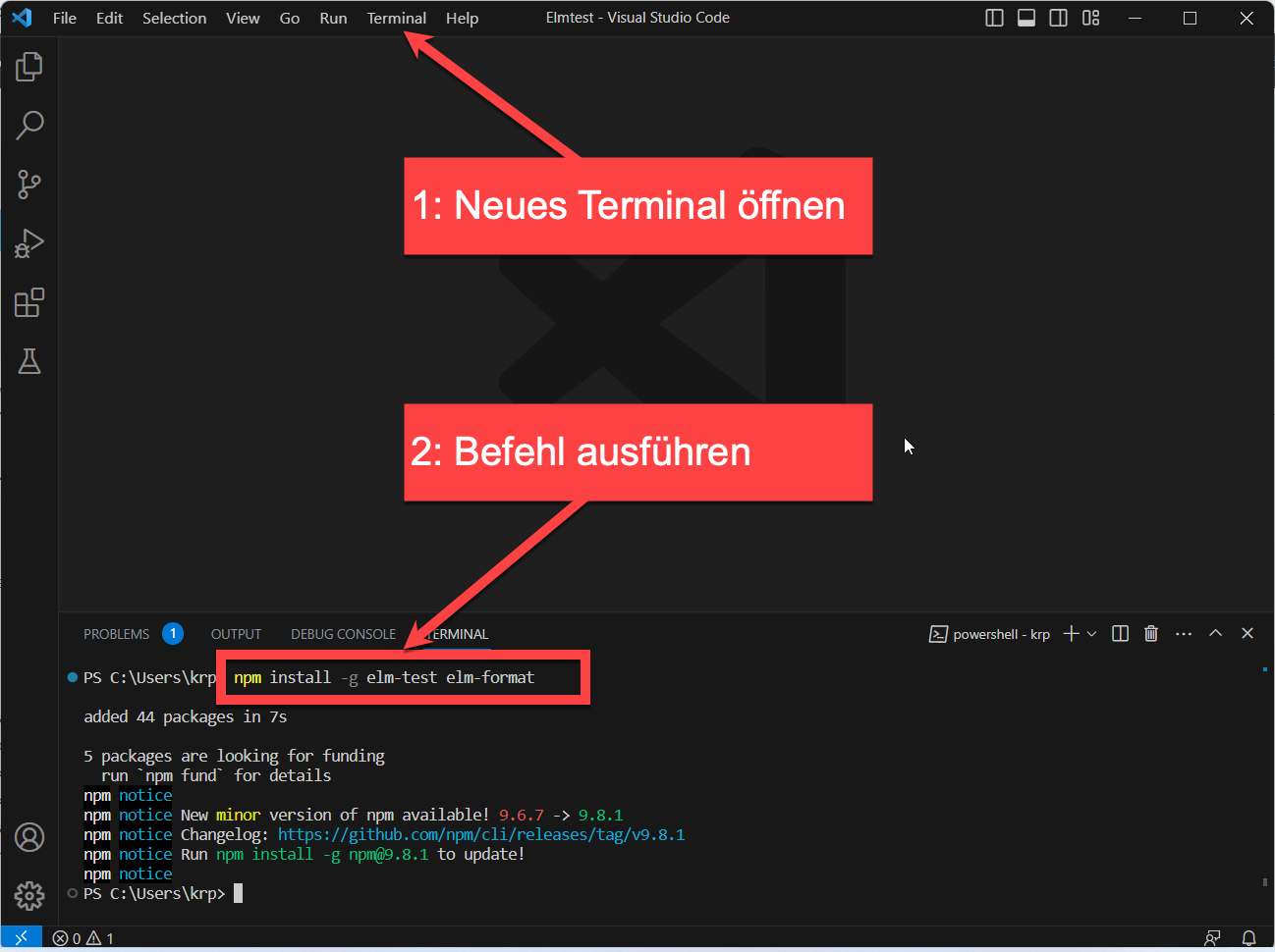 VS Code kann dich unterstützen bei der Analyse und Formatierung deines Elm-Codes. Dazu musst du die entsprechenden Programme installieren. Das erreichst du durch Aufruf des Befehls npm install -g elm-test elm-format im Terminal: