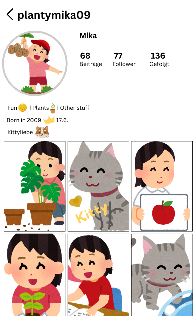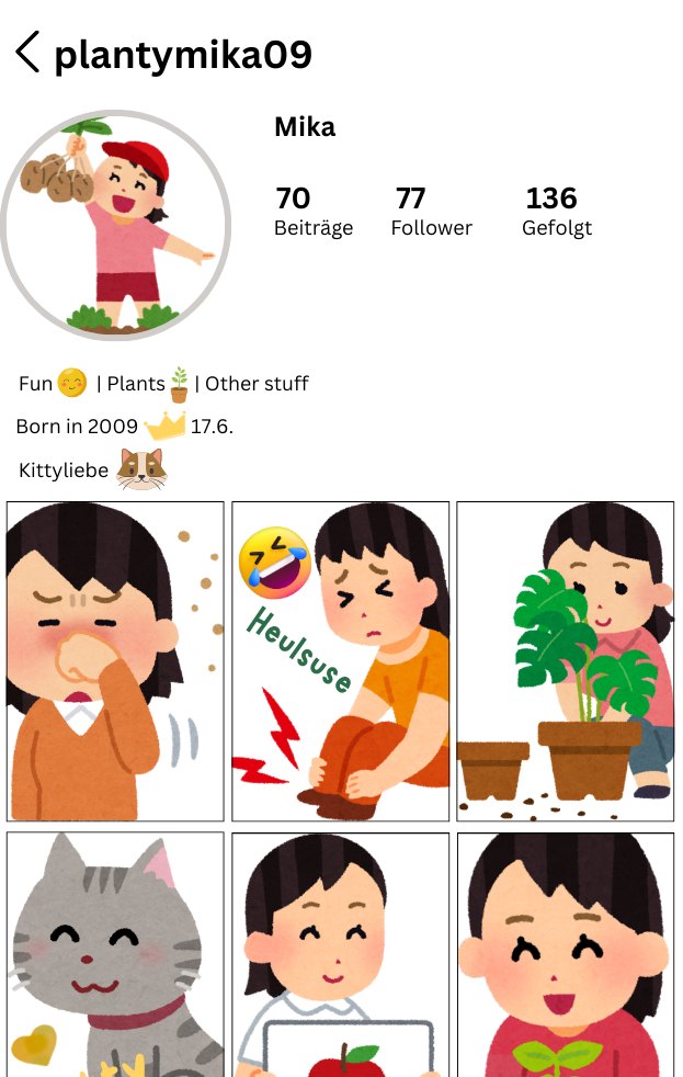 So auch Mika. Mika mag Pflanzen, Spaß haben und die Katze Kitty. Im rechts stehenden Bild siehst du Mikas Feed im sozialen Netzwerk.